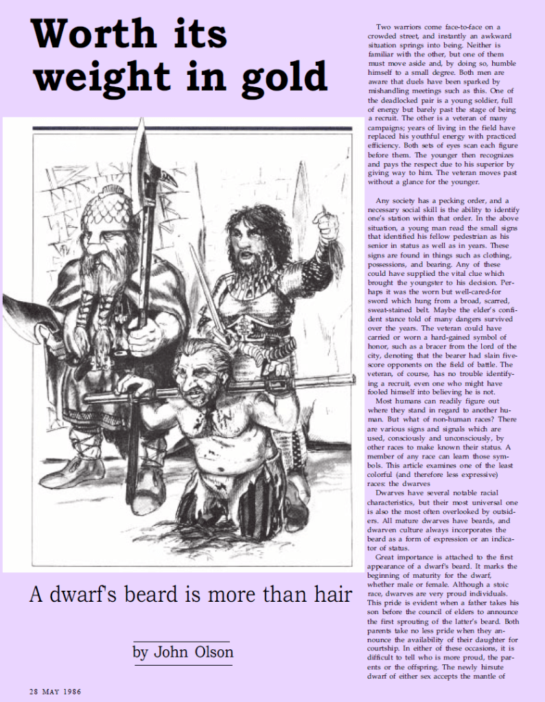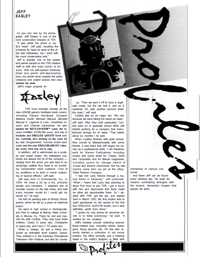 We also get plenty of more Roleplay oriented material, such as an article on the social structure of Dwarven societies and the ecology of the iconic Displacer Beast. We also get articles on how to modify the english language so it sounds more fantasyesque, articles on magical swords and giant weapons as well as new creatures for the D&D universe, such as half-satyrs and half-dryads. The profile section gives us profiles on legendary artist Jeff Easley and TSR Art Director Ruth Hoyer (one of the handful of women working in the company at the time).