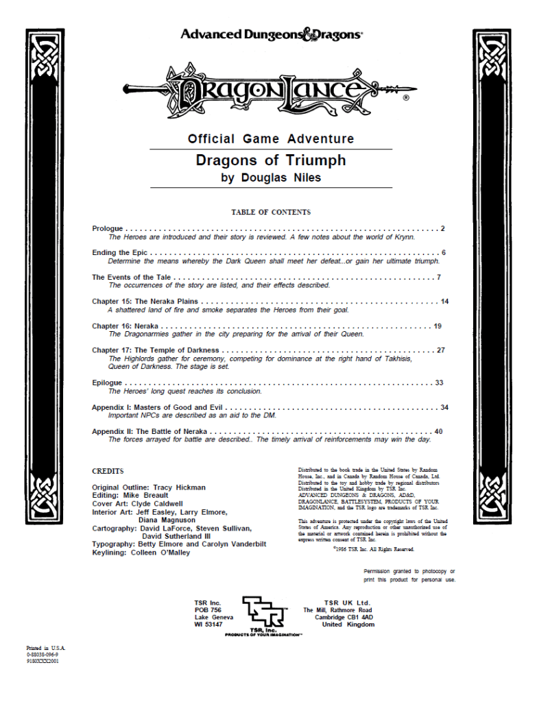 It is, then, a better deal than some of the other late DL modules which really seemed to exist for the purpose of stretching out the tale. DL14 is not only the adventure’s culmination but a useful repository of lore and campaign setting information, very much worth checking out if you are into the world of Krynn at all.