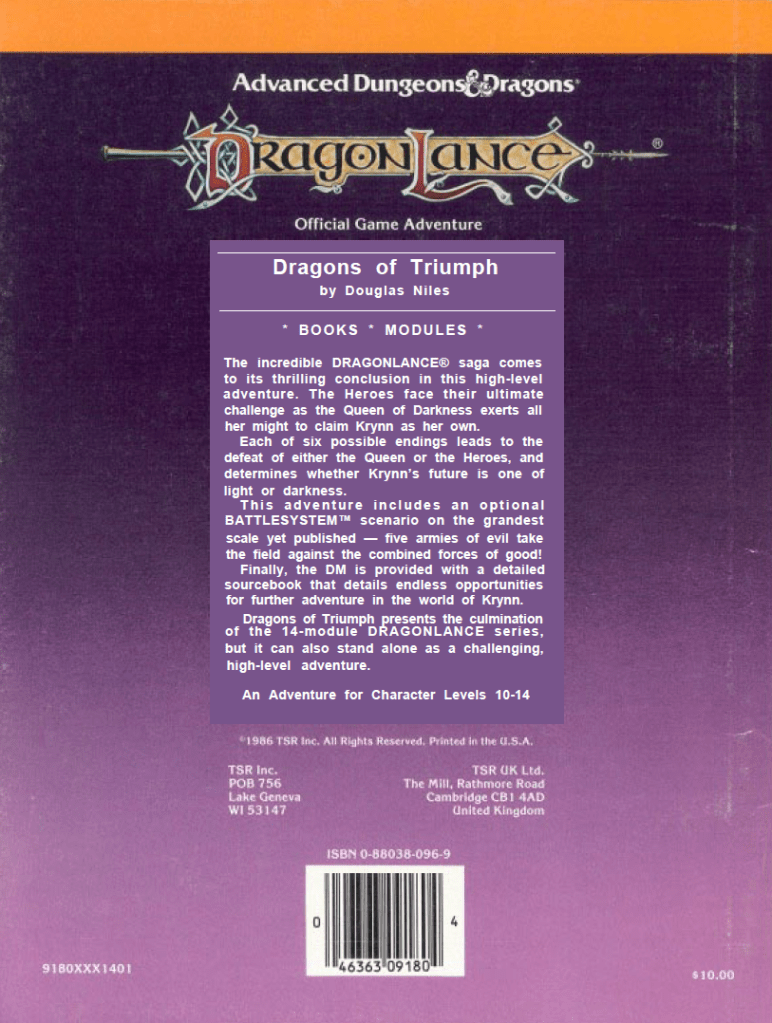 Finally, the story that started all the way back in DL1 in 1984 comes to its epic conclusion, fourteen modules later, with DL14, when the Heroes of the Lance get to face Takhisis in all her might in an epic battle that concludes the plot line of the Dragonlance Chronicles. Don’t worry, more Dragonlance modules will come in the future, but no DL series of modules was or will be as iconic as these first 14.
