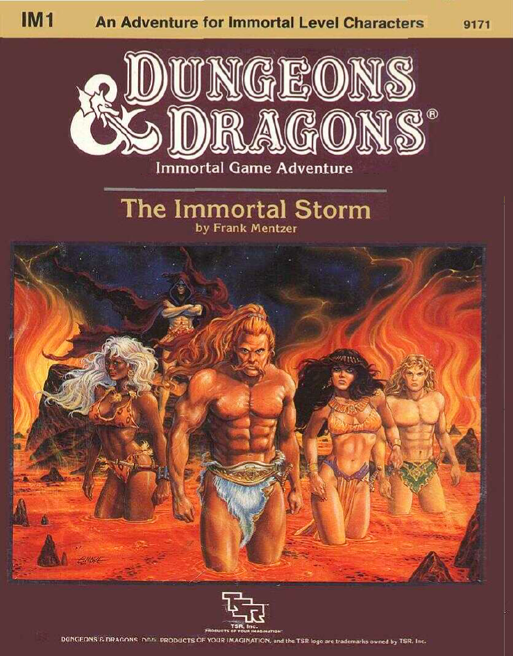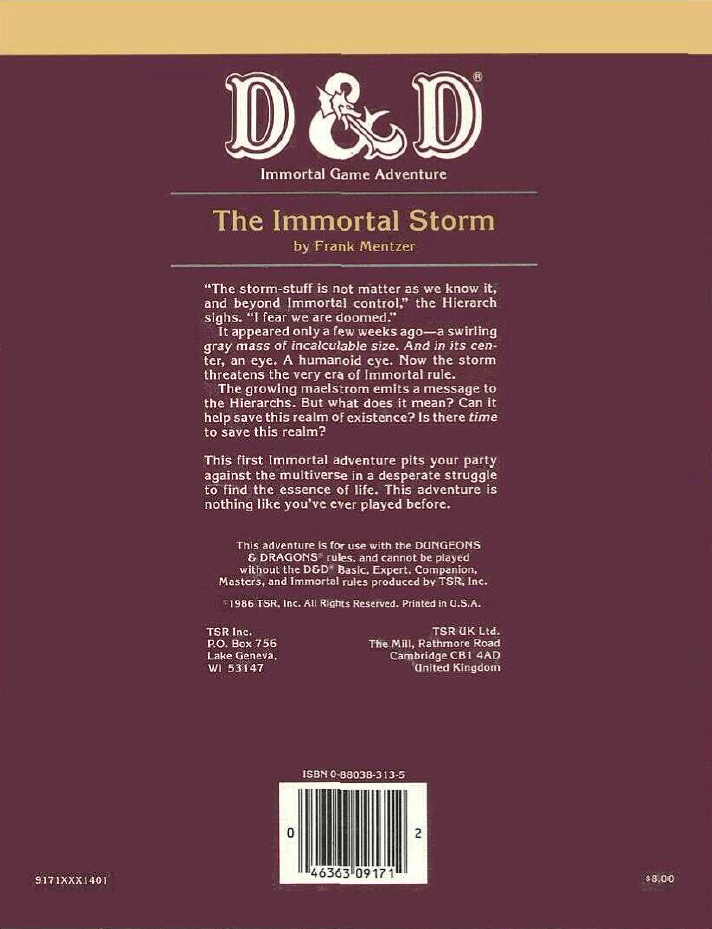 The first module for the Immortal levels of BECMI, this is an interplanar adventure that takes your party of Godlike high-level immortal adventurers into such exotic locales as New York, Chicago or a manufacturing plant in the fabled land of Skokie, IL. You will also go to weird worlds populated by musical staves and sentient musical notes.. a trip in more ways than one.