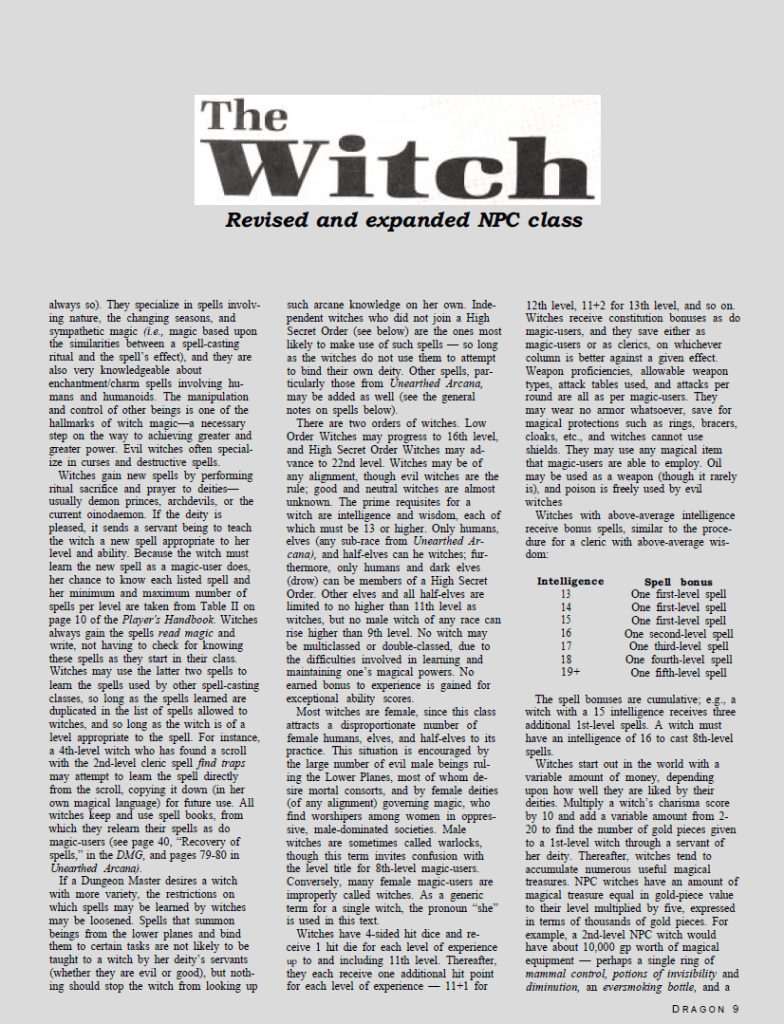 Another issue of Dragon, and this one is full of goodies. The main attraction here is the redesign and update of the Witch NPC (which actually can be used as a player class with a minimum of retooling, although TSR is always sure to say they are not to be used as PCs because they might be imbalanced… but you do you). Another NPC is also explored here in the shape of the Elven Cavalier.