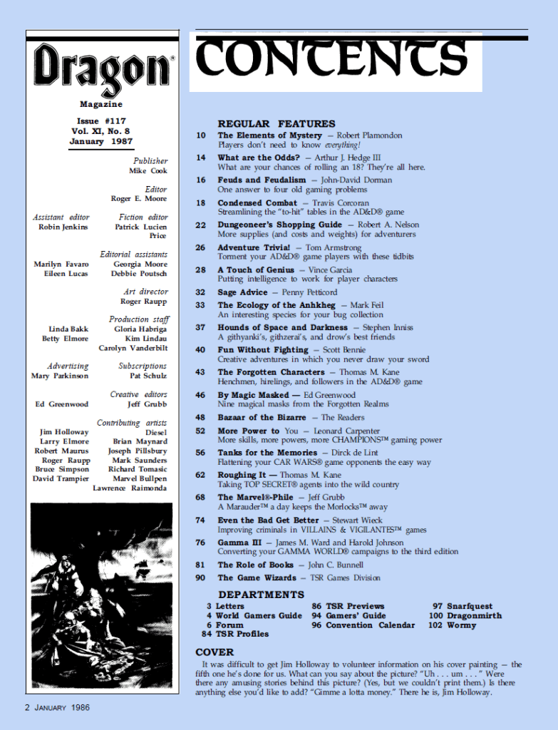 Of course none of this is present right here in the January issue of Dragon, but by the end of 1987 D&D will look a bit different indeed. In this first issue for the year we get the usual mix of articles exploring several aspects of the game form Greenwood’s usual Forgotten Realms tidbits (at this time still only his homebrewed campaign) with By Magic Masked, the Ecology of the Ankheg, guides to shopping, to using the Intelligence stat better in games, also a whole article on weird dogs for the githyanki, the githzerai and the drow.