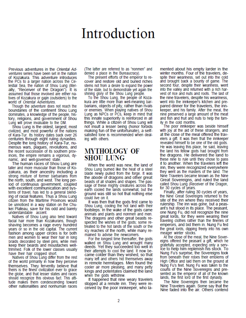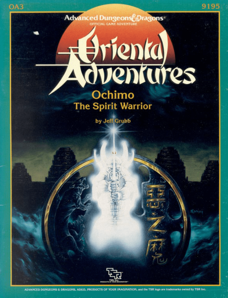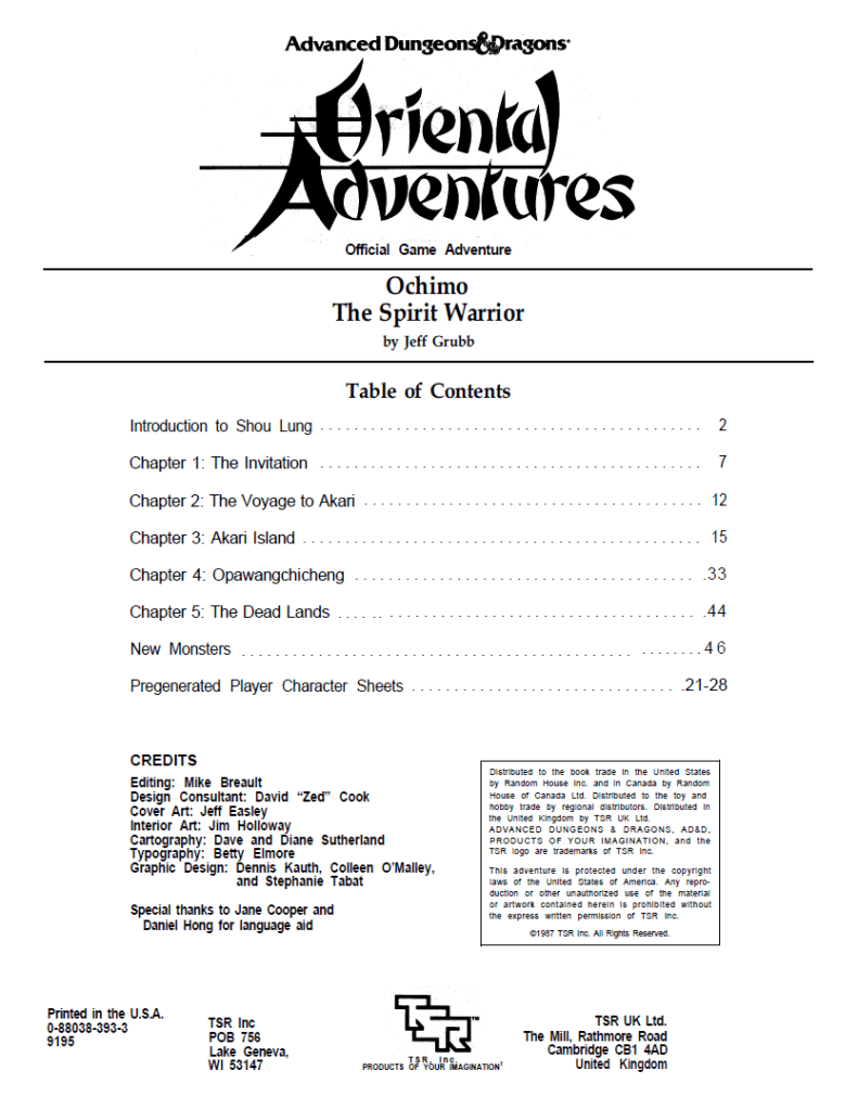 The third in the Oriental Adventures modules, Ochimo brings us to new lands. While your party starts out as natives of Kozakura (the Kara Tur version of Japan) or as “gaijin” if you’ve brought them from other non OA adventures, you will learn here about the culture of Shou Lung.