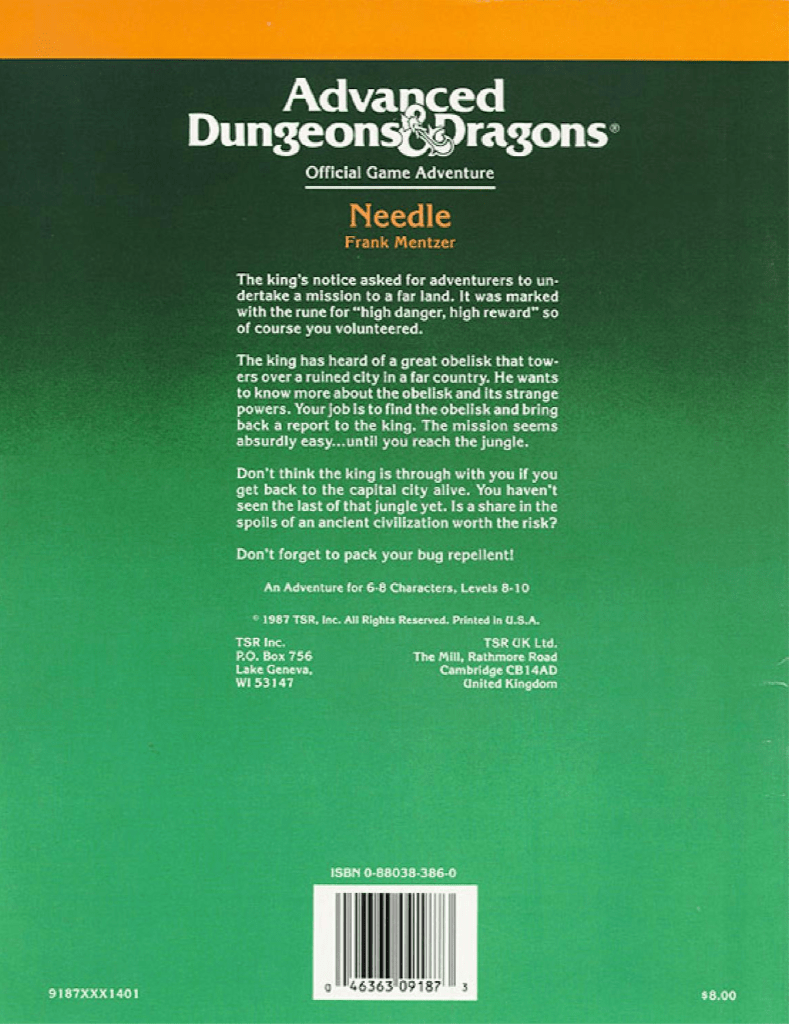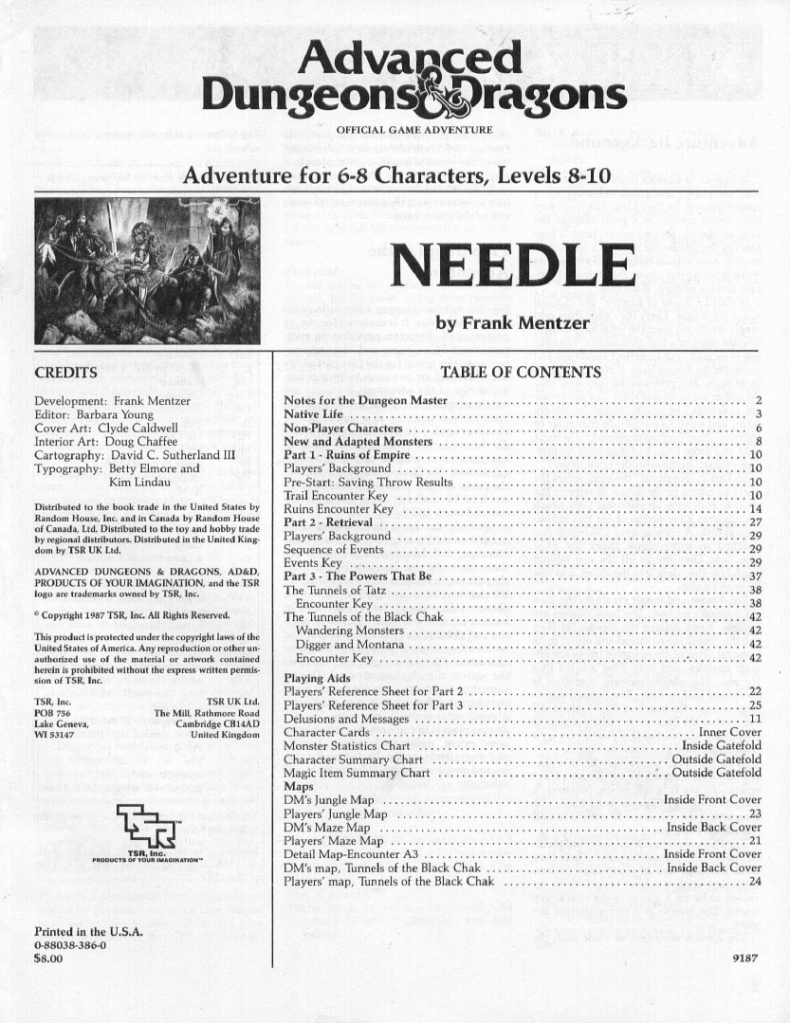 Essentially a repackaging of the adventure module that had been serialized in Polyhedron magazine starting with issue #24, back in 1984, Needle is originally, as all the modules published in Polyhedron, designed for competitive play. What does this mean? It means that a less than experienced party will very likely get their asses handed to them.