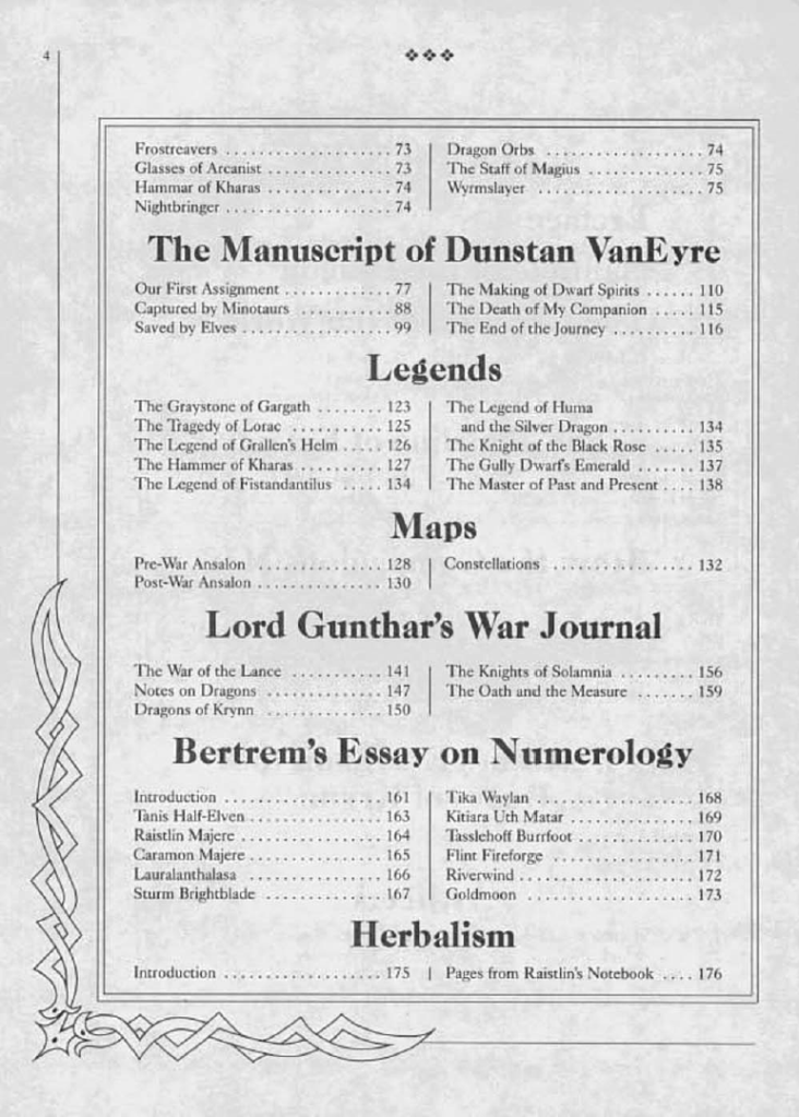 What you get in the book is an assortment of stories such as the ones about the creation of the world and the main gods of Krynn, as well as a general timeline, the story of how all the main characters met each other, the Races, Herbs, Rune and Songs of the world, as well as details on important artifacts as well as some famous legends.