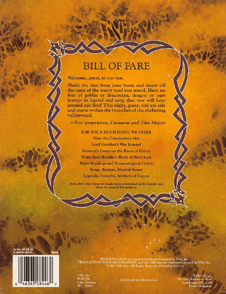 What a great little book. Subtitled: The Complete Krynn Sourcebook, it isn’t exactly that, but it isn’t far away. What it is is a pretty charming collection of lore and sundry facts about the world of Krynn, where the Dragonlance universe is set and the whole thing is put forward as if it was an in-universe book edited by Tika and Caramon Majere, two major characters in the Dragonlance Chronicles and by this point in the narrative the new owners of the Inn of the Last Home in Solace.