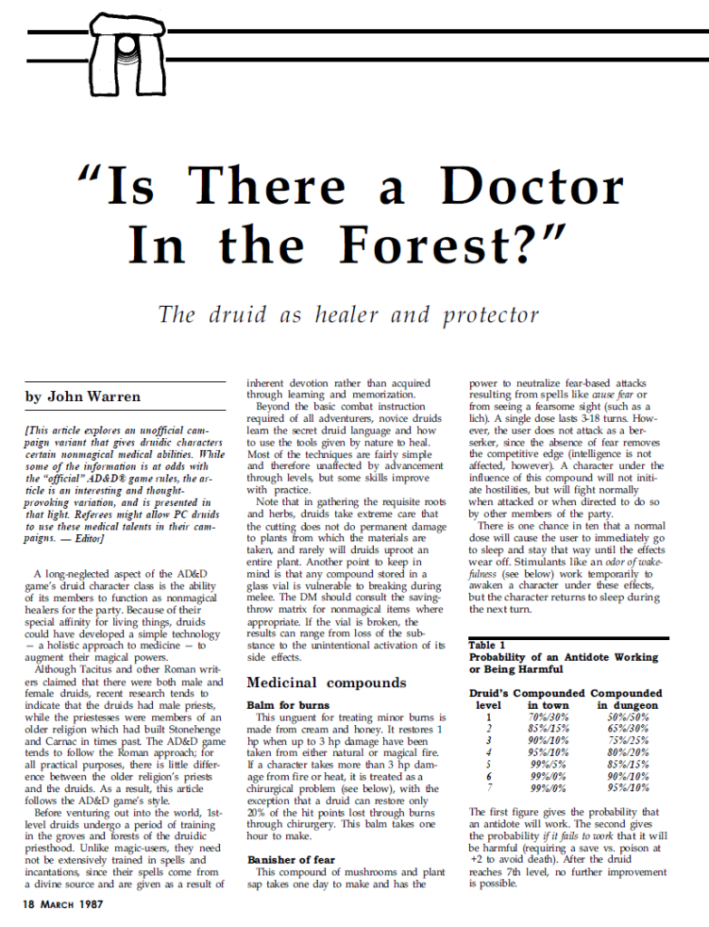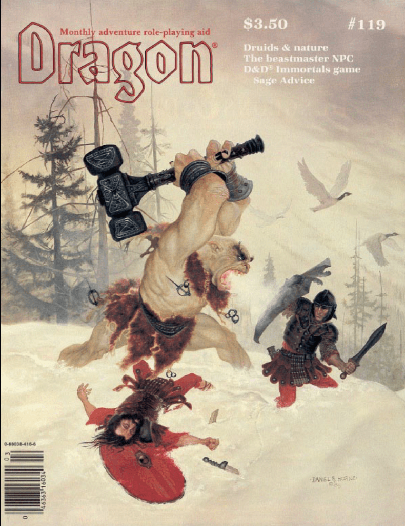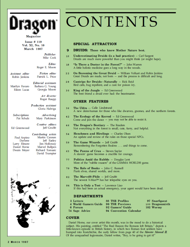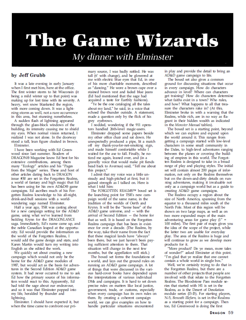 So this issue has a lot of interest for druids as well as extensive new bestiary entries. However, no single article in the magazine is more interesting to those charting the history of the game than an unassuming article, with no illustration or fanfare stuck in the middle pages, entitled The Game Wizards: My Dinner with Elminster.