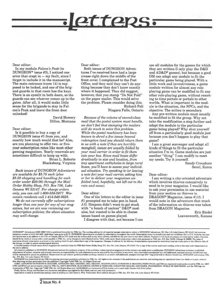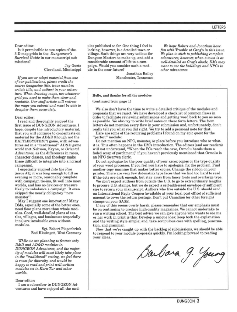 Another issue of Dungeon and another set of short adventures. Again, as in the previous issue, the focus is firmly on AD&D and this time the adventures skew towards lower levels, with one for first level characters, and others for characters levels 2-4, 3-5 and 6-9. In fact you could conceivably string them together and take a character all the way from levels 1-9 using only this issue.