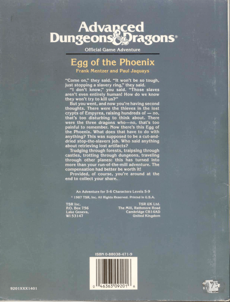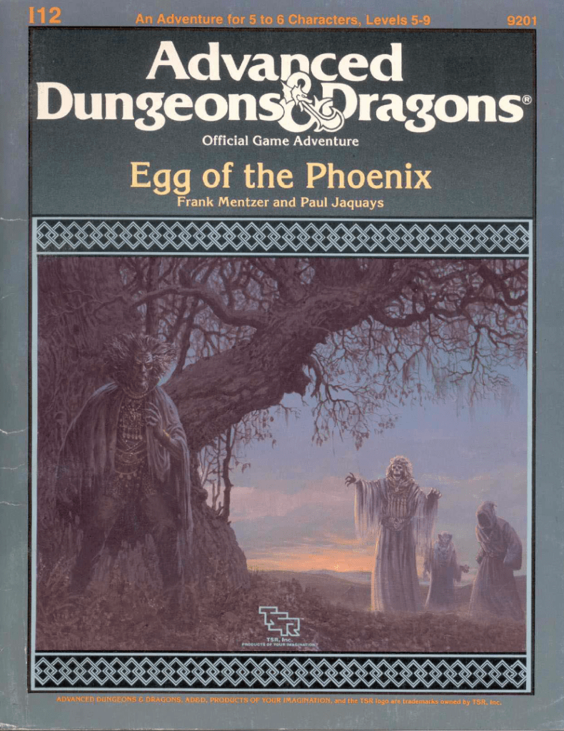 Sharing its name with the 1982 R-3: The Egg of the Phoenix module by Frank Mentzer, this was a limited edition for members of the RPGA association and as such there were never that many around. So, in 1985, in partnership with Jennell Jaquays (who is credited in the module under her deadname, which I won’t use here), Mentzer will re-write that module and add others from the R-series to give us this I12 module.
