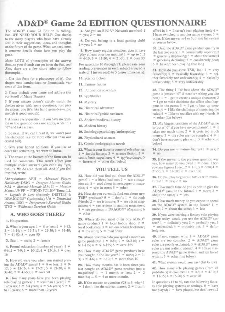 So yeah, as you can see this is a lasting change to the game and particularly the organized play side of it. Another thing pointing at the future of the game is the really extensive questionnaire about the second edition of AD&D… three hundred questions on the back of the magazine that ask about game habits and what players would desire from a new edition of the game.