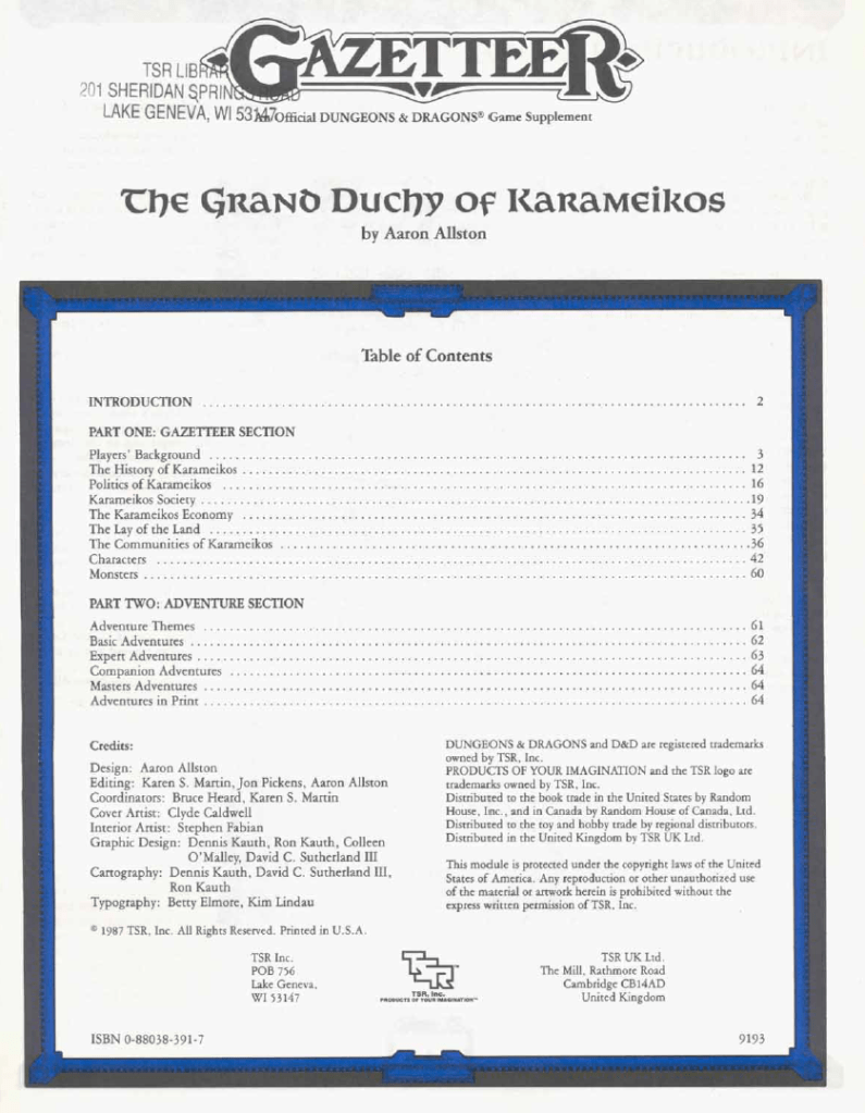 This and the upcoming Gazetteers will do much to flesh out the world in which BECMI is set by giving in-depth information about all kinds of areas of the world. In this volume of around 65 pages, we get everything we need to know about Karameikos, a place in which several published adventures have been set and which can serve as a good starting point for new players. We get details on geography, history, politics, economy as well as notable characters in the Grand Duchy.
