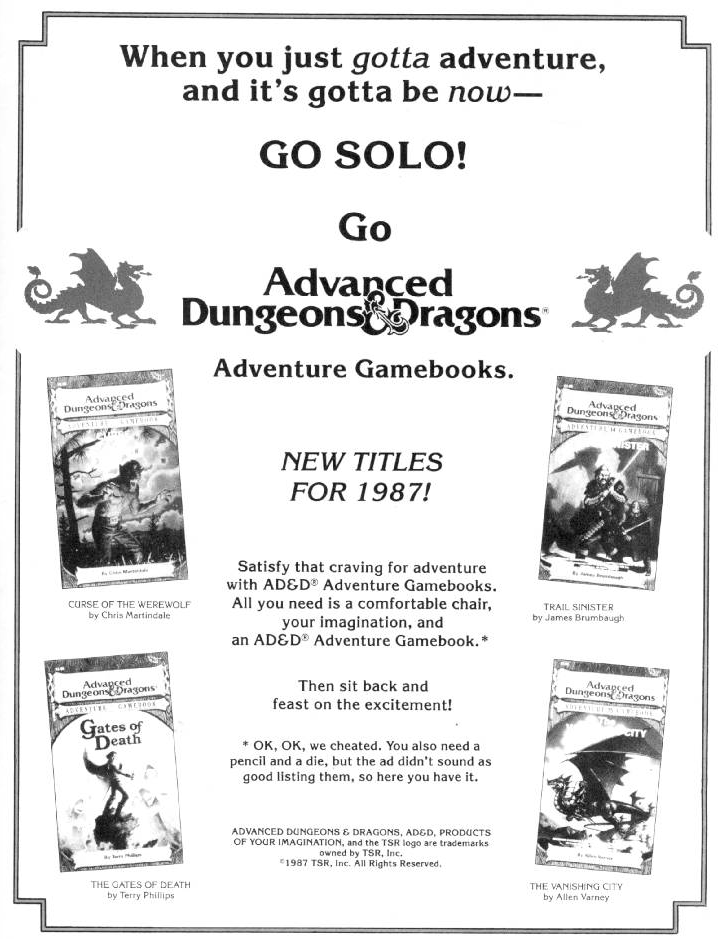 Even as the Endless Quest books went on hiatus, TSR kept on publishing non-TTRPG gamebooks through the AD&D Adventure Gamebooks series. This series would go on for a little while still, with half a dozen volumes stretching into 1988.