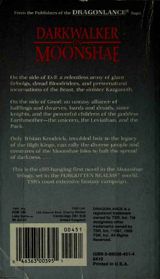 The first product to actually sport the Forgotten Realms logo on the front cover was not a module (some that came out at the same time had it on the back cover) or a source book for the world of Faerun, but a novel, Darkwalker on Moonshae by Douglas Niles. We’ve seen Niles here before as one of the writer for TSR adventures and books, so it was very much an in-house hire, and we’ll see him several more times as the years go on.