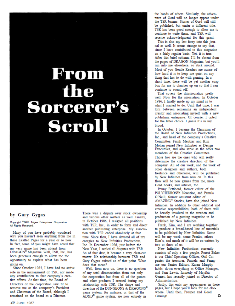In this last column, Gygax explains where he has been and how he was let go from TSR, how he hasn’t contributed to the creative efforts of TSR since October 1985 and how he completely left the company one year later in October 1986. He also talks about his new endeavour, New Infinities , a short-lived game company through which he published some stuff that we will cover here in the future, namely the remaining Greyhawk novels featuring Gord, the Rogue. I know it isn’t official TSR material, but it would feel wrong not to cover stories set in the original setting for AD&D by the game’s own creator, so I’ll do that! (I’m now finishing Sea of Death which will be covered here soon).