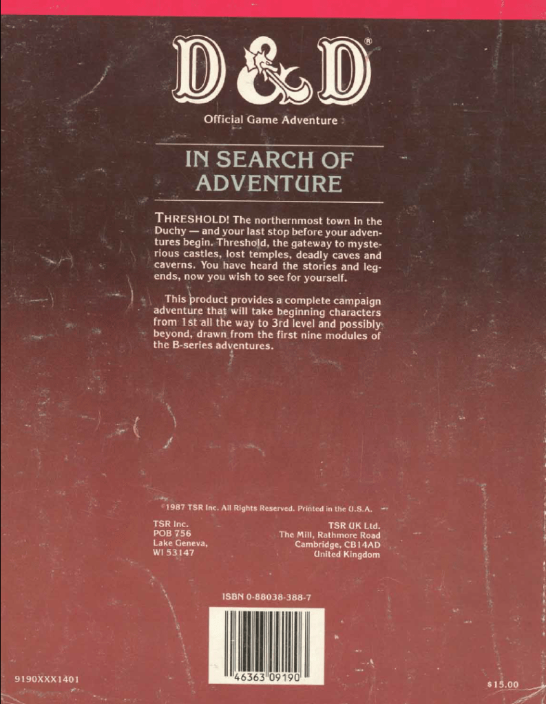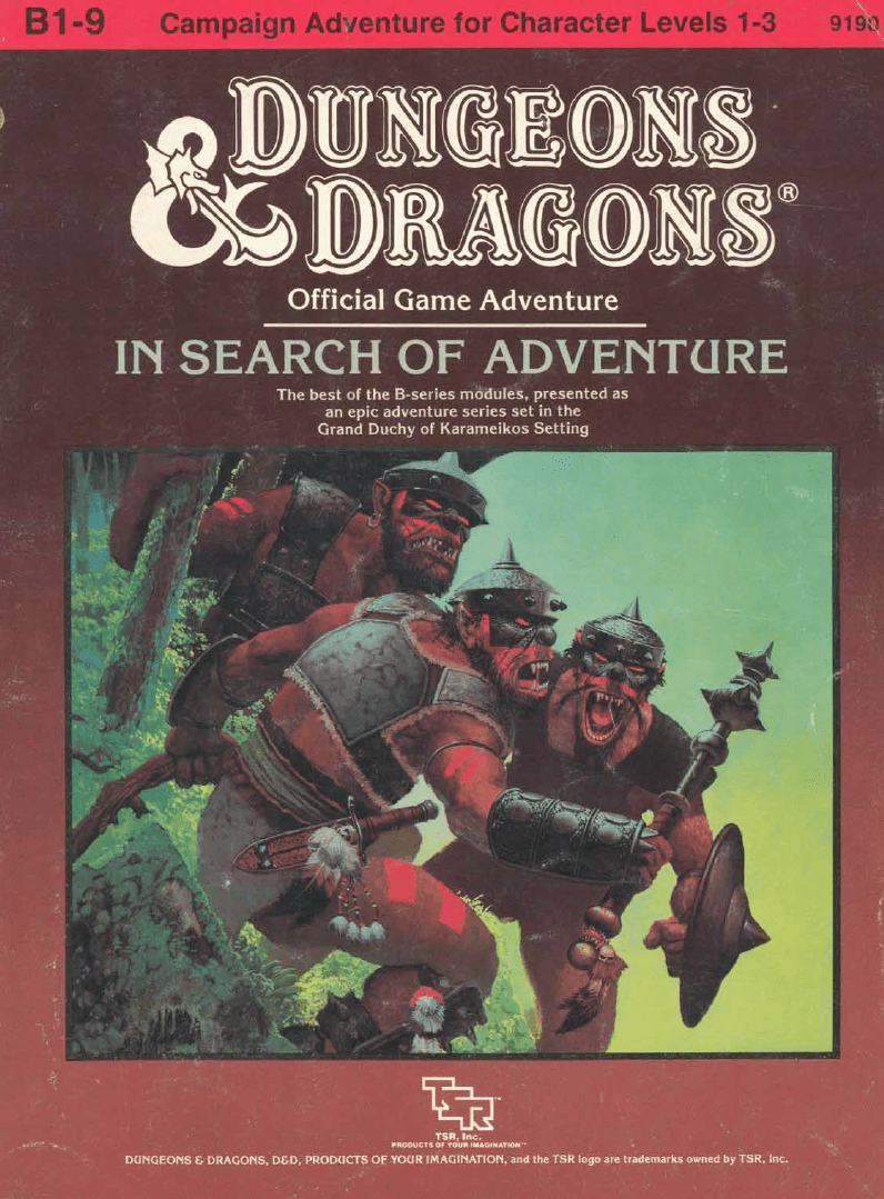 A mashup of 9 other modules, basically all the Basic D&D modules put out by TSR US (B10 was put out by the UK team), this is a full campaign for Basic D&D, leading characters from levels 1 to 3 in an extended 160 page module. The adventures are modified from the originals so they can now all fit together as a coherent storyline, so don’t go in expecting to find what you did in the individual modules, but more of a collage of elements from B1-9.