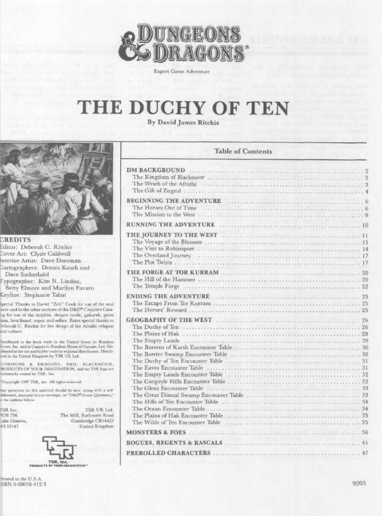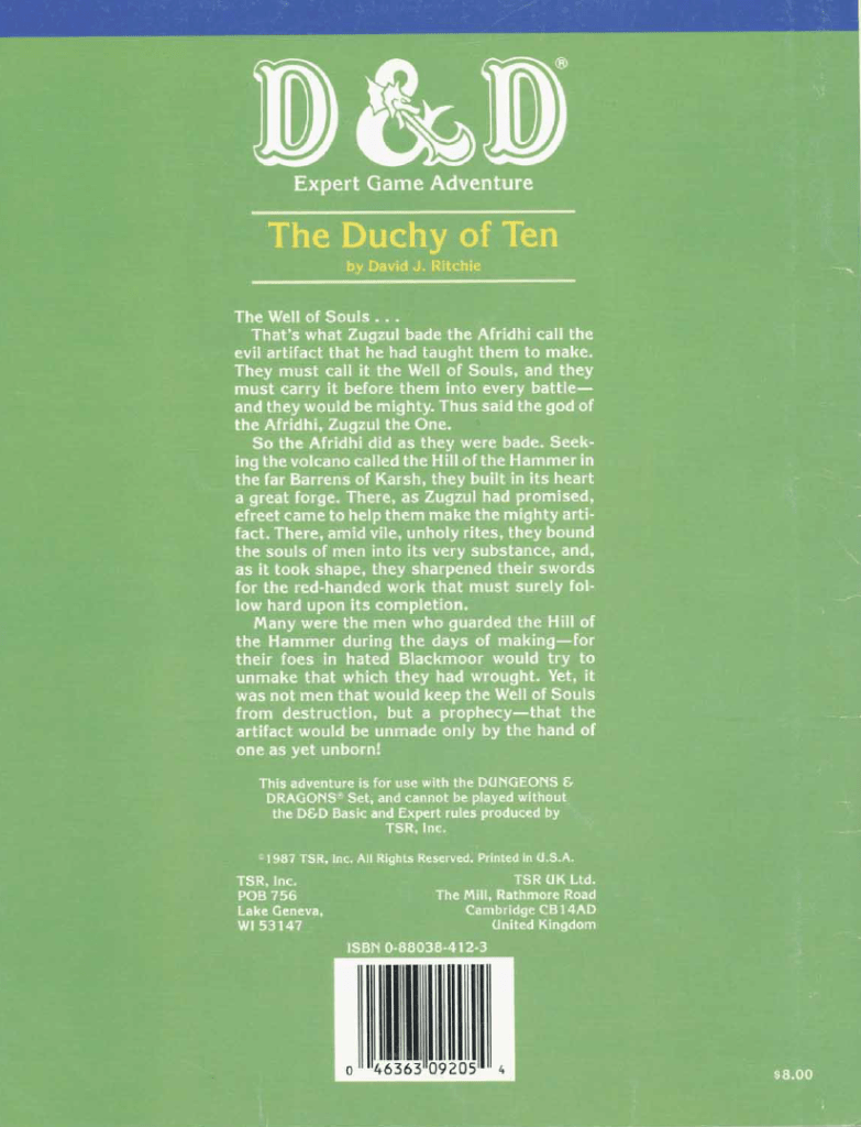 Set some 3,000 years before other adventures in the BECMI setting this adventure explores the Duchy of Ten (not to be confused with Greyhawk’s Duchy of Tenh) and much of it takes place in a boat at sea as the party looks for the Well of Souls, there are some interesting sea chase mechanics which make the adventure more unique.