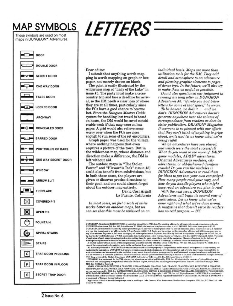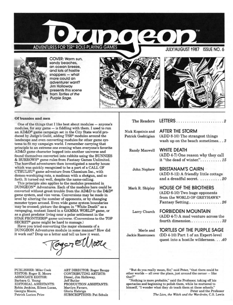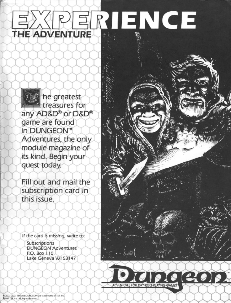 Inside the magazine we find 6 adventures for AD&D players, ranging from levels 4 to 12 and one single adventure (the first part of a multi-part series, apparently) for players of Expert level D&D. As usual there is a mix of more serious and other more humorous or madcap adventures and in the next post here you’ll be able to see the first page of each of those adventures so you can judge by yourself.