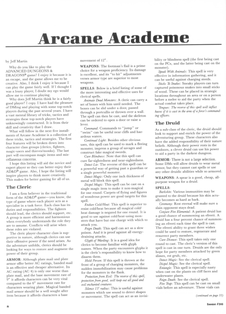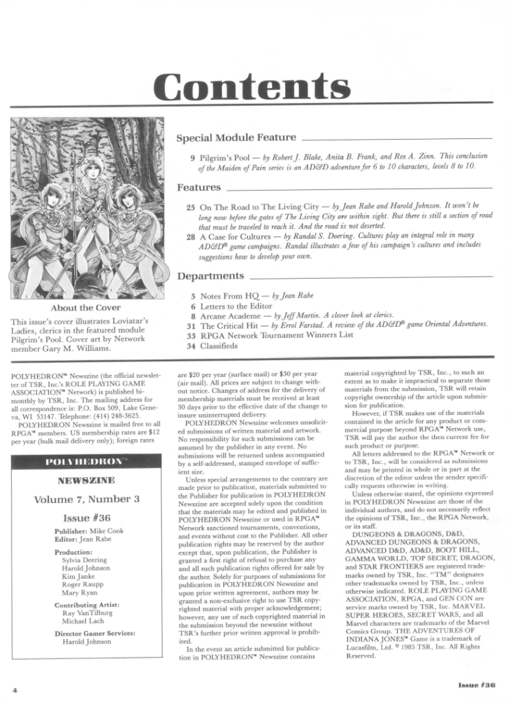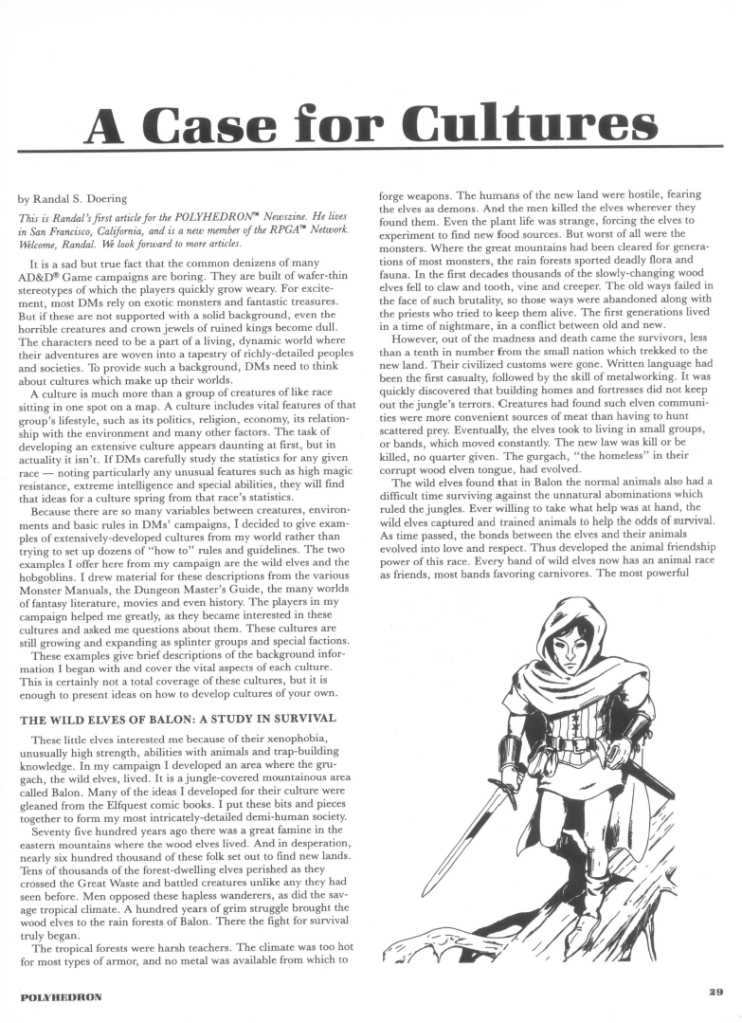 Articles in this issue include an article on Clerics as well as an update on the ongoing Living City project (a setting aimed at competitive play) and a pretty good article on the importance of building three-dimensional cultures for “monsters” instead of making do with stereotypes and paper-thin depictions of complex societies. We get examples of cultures for Wild Elves and Hobgoblins, encouraging DMs to create their own deep lore for creatures in their games.
