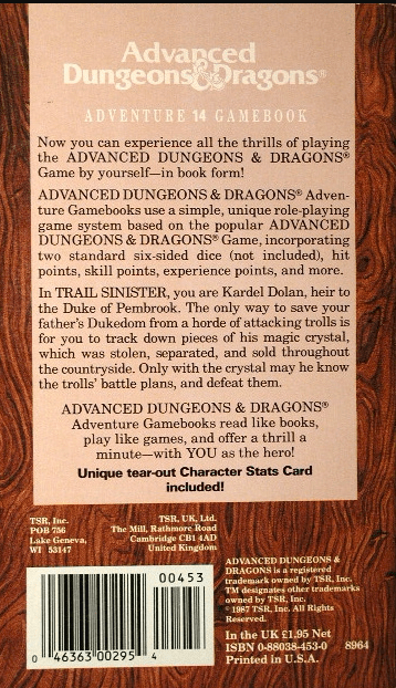 So, what we have here is another of the AD&D adventure gamebooks, a series which was by now winding down, much as the Endless Quest books, and this is clearly not the best effort, a short book with big print, reports from Damien’s Gamebook Page (gamebooks.org) are pretty unimpressed with this one. So yeah, read the back cover for all the plot info I have on this, or go to Damien’s page to read some reviews of the book itself.