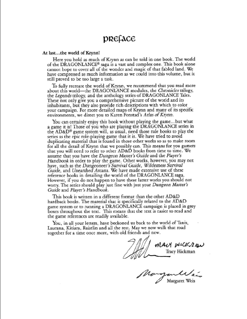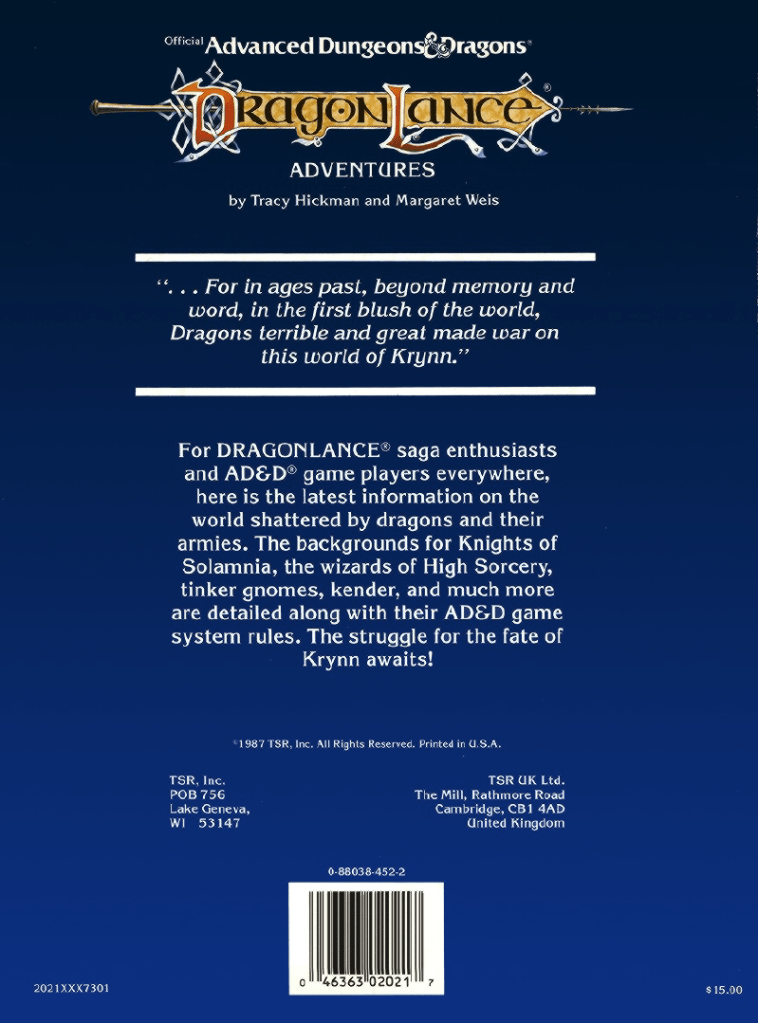 As the Dragonlance modules came out (DL1-12 came out between 1984-86, four more will come out in the future), each of them would contain some information about the world of Krynn where players would go on the epic tale novelized in the Dragonlance Chronicles. This means, however, that there was no actual volume which contained all Dragonlance lore and setting specific classes and races in one place.