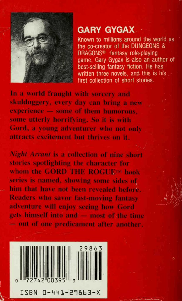Written by Gygax and set in the Gord the Rogue sequence of novels, mostly in and around the city of Greyhawk, this is a collection of nine short stories. I’ve always had kind of a hard time reading Gygax’s writing and this is no exception, he has a very deliberate flow that clearly owes a lot to some of his writing and thematic influences, foremost among them being Fritz Leiber and Robert E. Howard. As you read through the stories it is in fact very easy to see how these sword and sorcery pioneers were the biggest influence on Gygax, rather than Tolkien or other high fantasists.